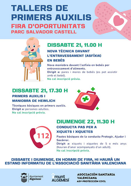 L’Ajuntament d’Algemesí ha inclòs en la programació de la Fira d’Oportunitats 2026 tres tallers gratuïts de primers auxilis dirigits a persones adultes i a xiquets i xiquetes. L’objectiu és oferir pautes bàsiques d’actuació perquè la ciutadania puga intervindre amb responsabilitat davant possibles incidències o emergències.