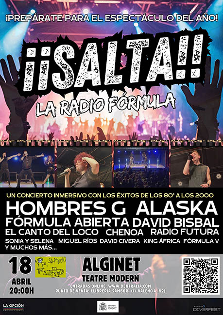 El Teatre Modern d’Alginet acollirà el pròxim 18 d’abril de 2026 la representació de “¡SALTA! La radio fórmula”, un espectacle musical centrat en grans èxits dels anys 80 i 90. La proposta planteja un format de festival en directe amb música, guió teatral basat en la improvisació i una posada en escena orientada a la participació del públic.