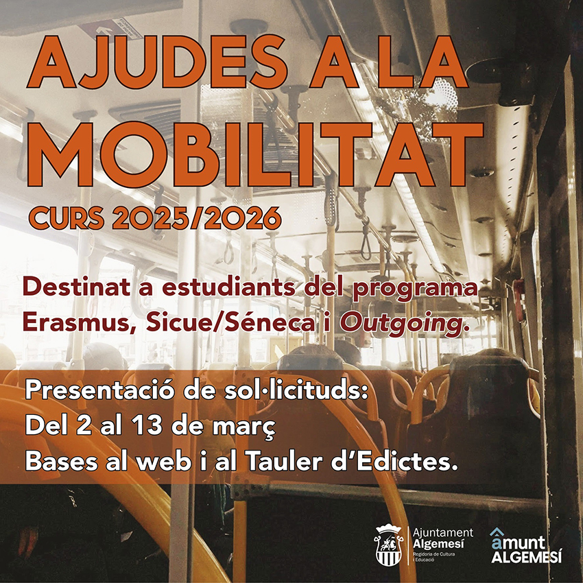 L’Ajuntament d’Algemesí destinarà fins a 15.000 euros a les beques de transport del curs 2025/2026 adreçades a estudiants del municipi que participen en programes de mobilitat com Erasmus, Sicue/Séneca o altres iniciatives nacionals i internacionals. Les ajudes ja es poden sol·licitar a través de la seu electrònica municipal fins al divendres 13 de març.