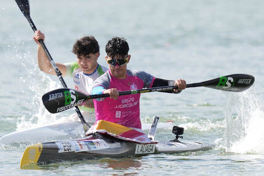 Per la seua banda, Izan Aliaga (22 anys), del Rías Baixas Boiro (Pontevedra), està ja plenament instal·lat en l’elit del fons. No va arrancar entre els primers, però a base de coratge, en superar el quilòmetre ja estava en el grup davanter. Abans de cada boia hi havia fortíssims canvis de ritme que Aliaga aguantava sense rebentar-se. Però sabia que el seu fort no és l’esprint final, per la qual cosa en els últims dos quilòmetres va atacar en diverses ocasions per a anar despenjant rivals. Fins que en eixir de l’última boia, a 500 metres de meta, va llançar un atac demolidor que li va permetre arribar als últims cent metres en posició de podi. Després d’un disputat esprint final, va aconseguir el bronze (21:26:51). Va véncer Ernesto Goribar (21:24:75, Colindres de Santander) i fou plata Arturo Aguilar (21:25:98, Escuela de Piragüismo Aranjuez). Per la seua banda, els membres de l’Scooter Marc Martínez, que va bolcar en la primera boia (23:46:48), i Enrique Oria (24:14:08) van finalitzar en els llocs 54 i 57, respectivament. En home sènior K-1, Mario Masiá (Scooter, 22:44:49), arribà el 51, i el seu company d’equip Carlos Moreno (23:16:71), el 53.